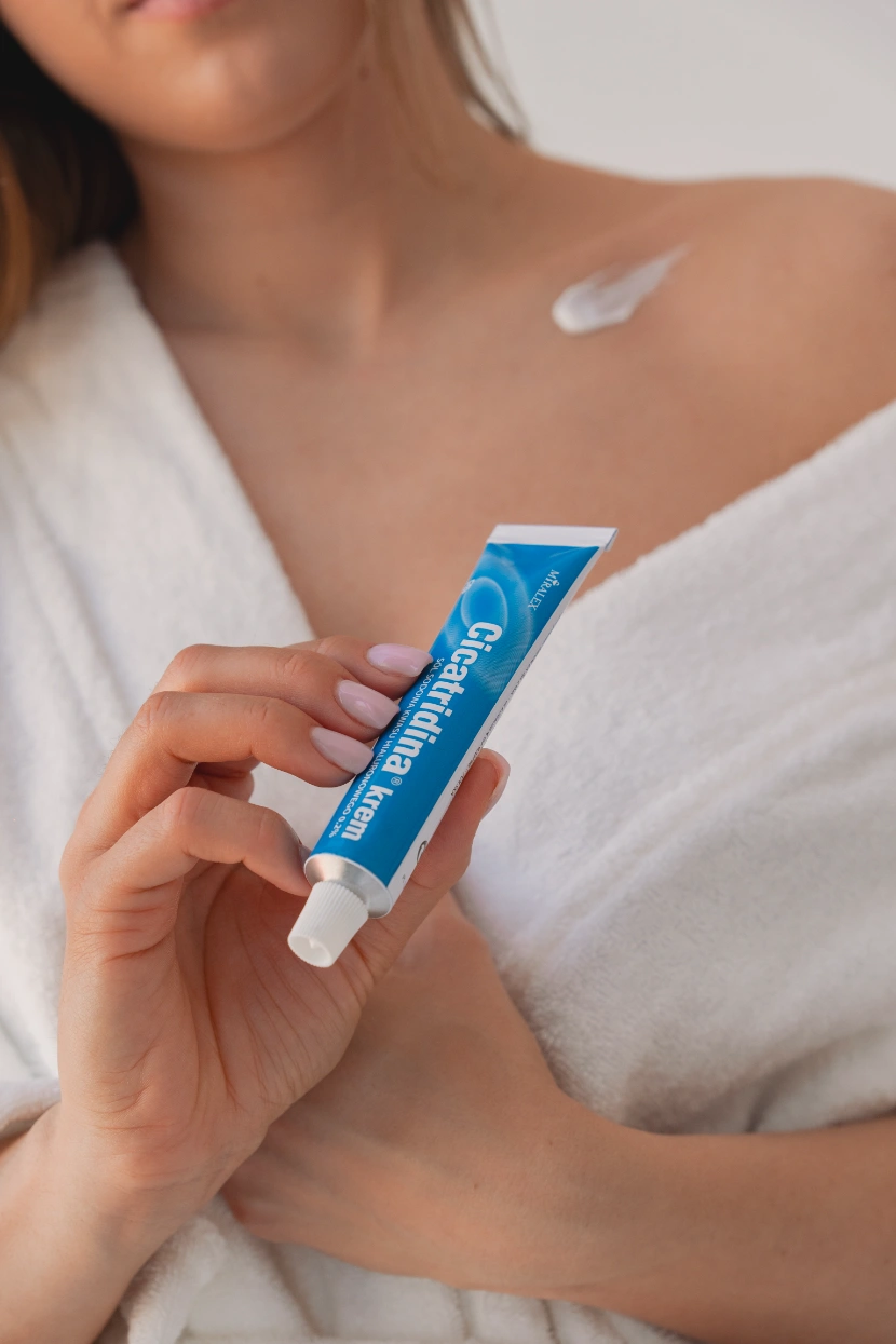 Nałóż cienką warstwę Cicatridina kremu. Krem wspiera gojenie dzięki kwasowi hialuronowemu, odżywia skórę i chroni przed zakażeniem.